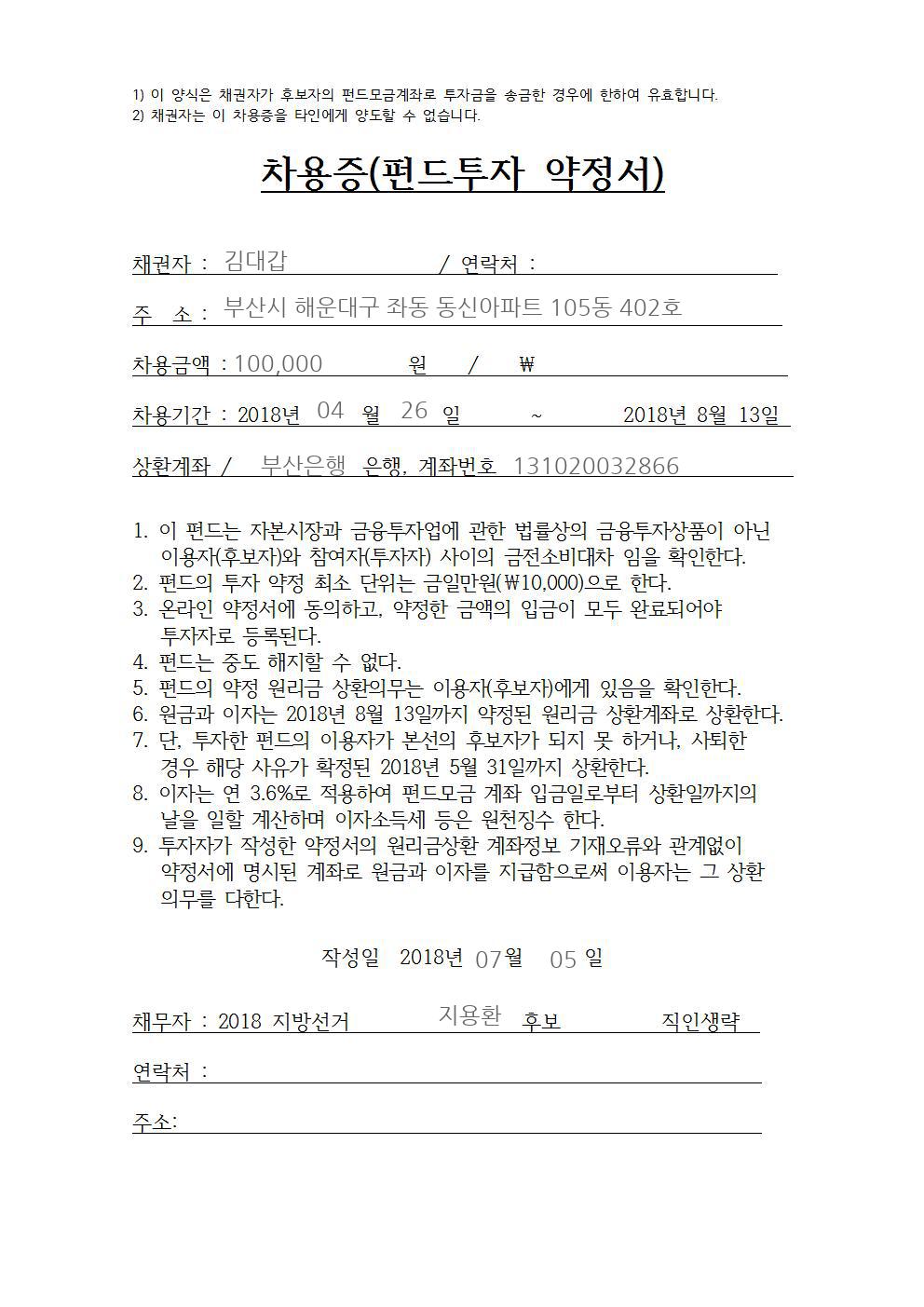 | 10 | 1회차 | 김대갑 | 김대갑 | 지용환 | 더불어민주당 | 농협은행 948-0215-9176 | 100,000원 | 승인 | 수정 |